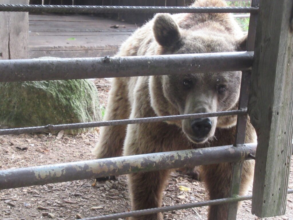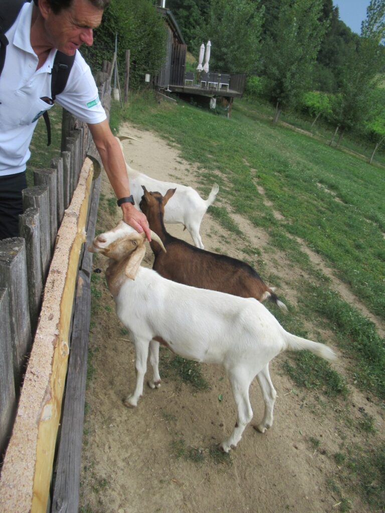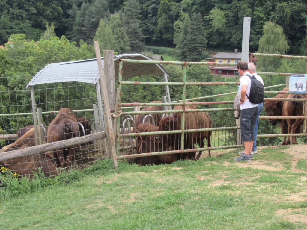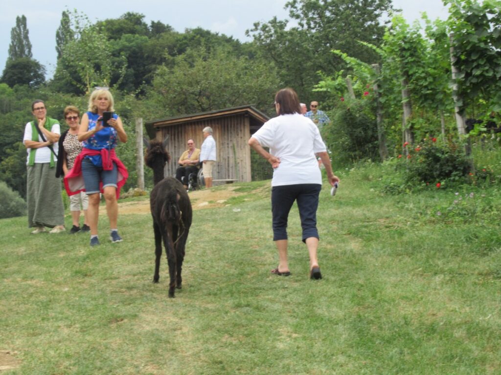Mit einem kleinen Zwischenstopp bei einem Eisgeschäft stiegen wir dann in den Bus, um über die SÜDSTEIRISCHE WEINSTRASSE zu unserem nächsten Halt, dem BÄRENHOF BERGHAUSEN, zu gelangen. Hier finden Bären, deren Geschichte nicht immer von Freude geprägt war, ein neues Zuhause und auch andere Tiere leben hier. Bei unserem Rundgang durch die Anlage wurden mancher Reiseteilnehmer von einem Alpaka begleitet.
