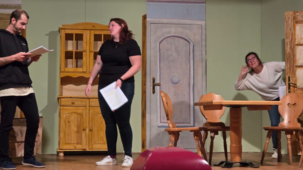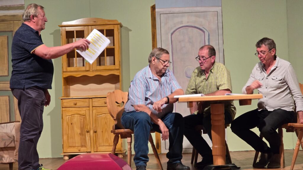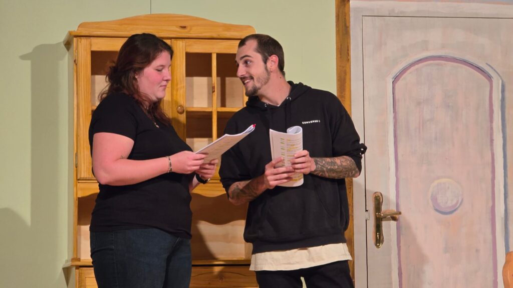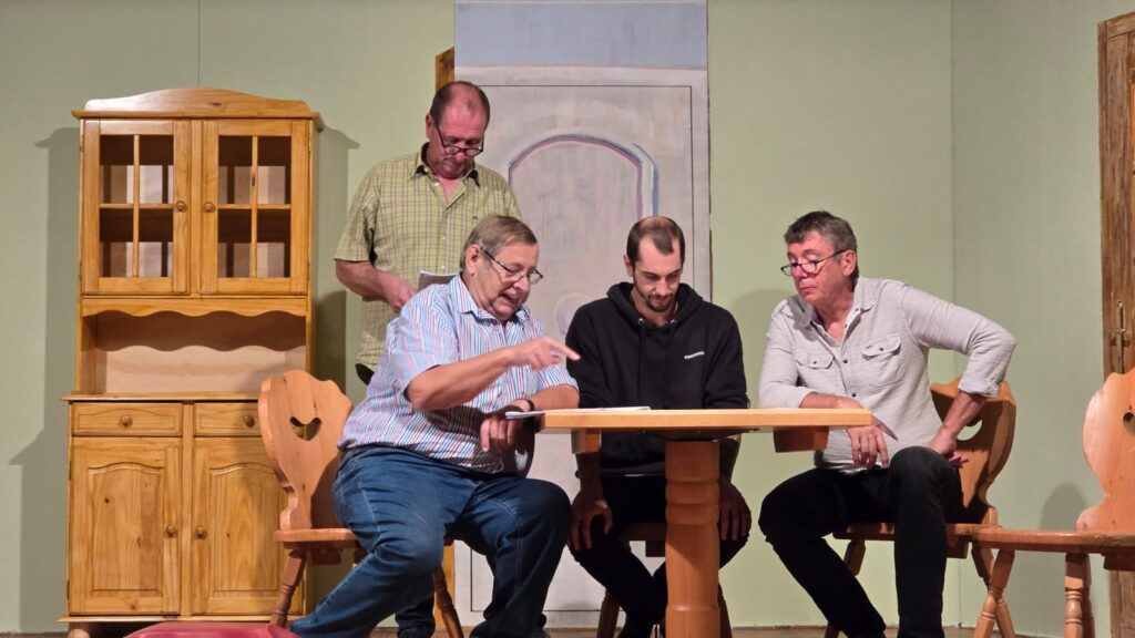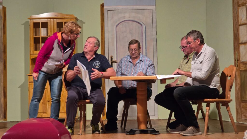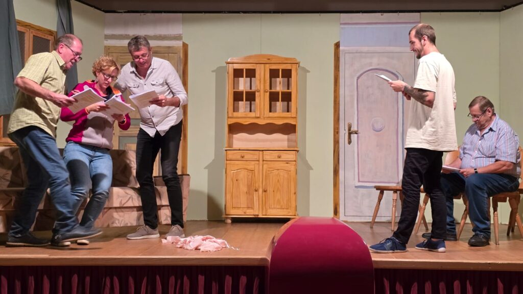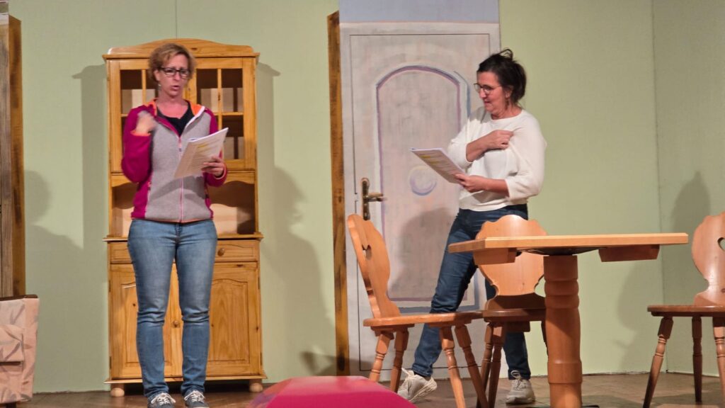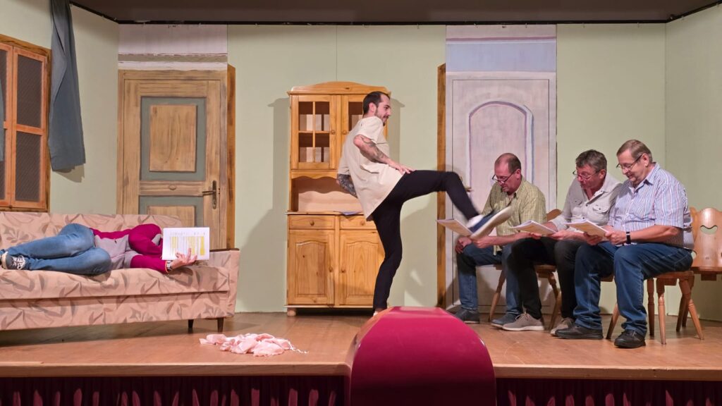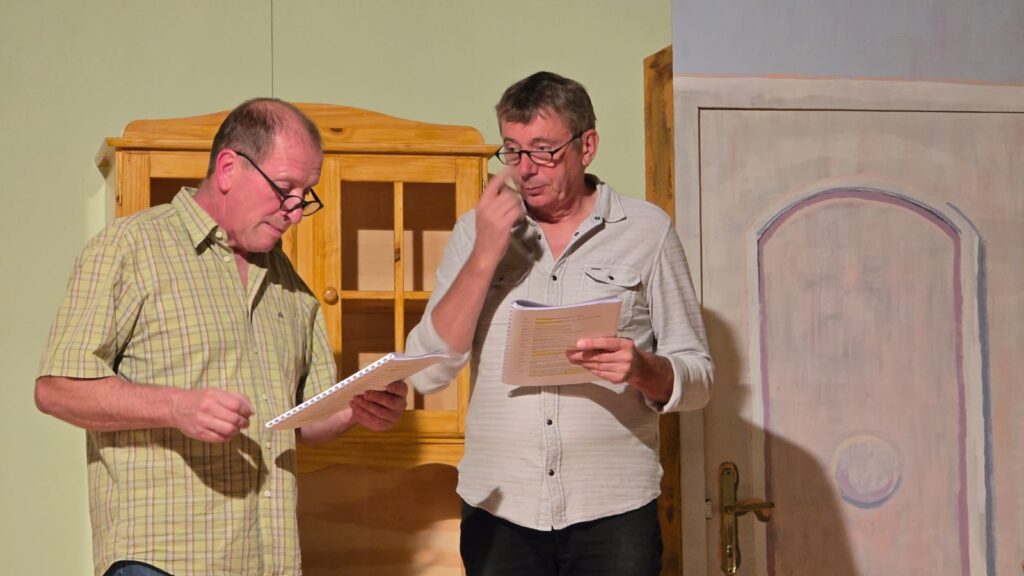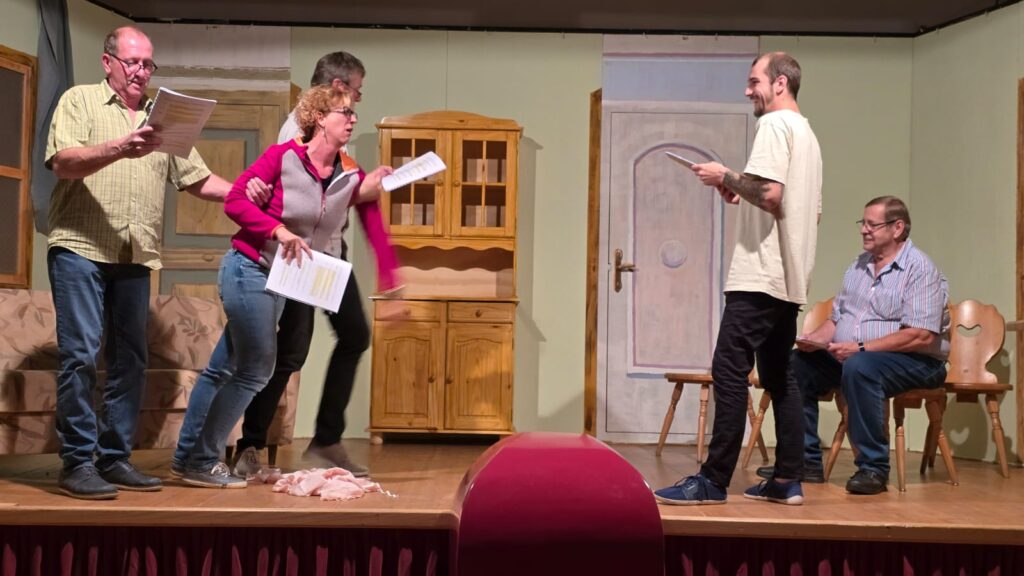 Nachdem am Freitag, 19.09., in kleiner Runde die Bühne aufgestellt wurde, konnten wir am 23.09. mit den Bühnenproben starten. Leicht überfordert durch die neue Situation, die unterschiedlichen Türen, das noch fehlende Equipment und dem Buch in der Hand hatten wir dennoch eine tolle Probe, die uns wieder gezeigt hat, dass unser neues Stück sehr turbulent wird! Um nicht zuviel zu verraten, sind die Fotos nicht chronologisch sortiert 😉 Wir freuen uns auf euren Besuch!